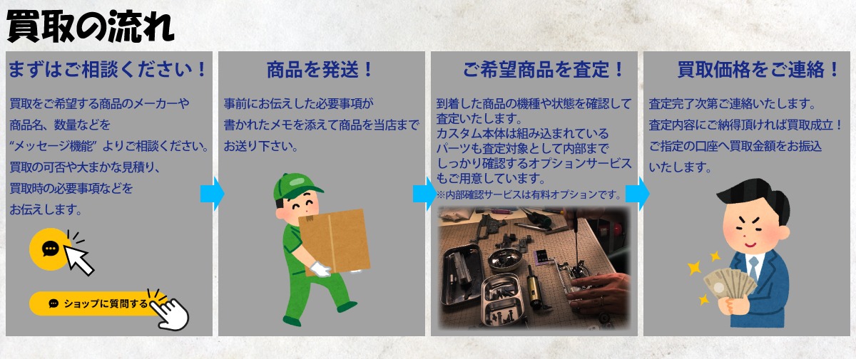 一般的な買取専門店と違いエアガンの修理やカスタムを行うプロショップですので、カスタム品はもちろん不動品や故障しているものでも買取可能です。
