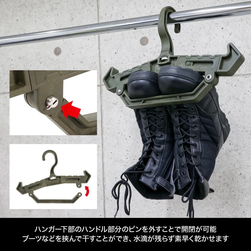 プレートキャリアやチェストリグを掛けるのに最適な高耐久ハンガー!肩部の伸縮や向きの変更をすることで、吊るす物や用途に合わせた使い方が可能です。フックの向きを90°回転することができ、メタルラックなどにかけることもできます。下部のハンドル部はピンを片方外すことで開閉できます。最大50mmまでのハンガーパイプに対応!