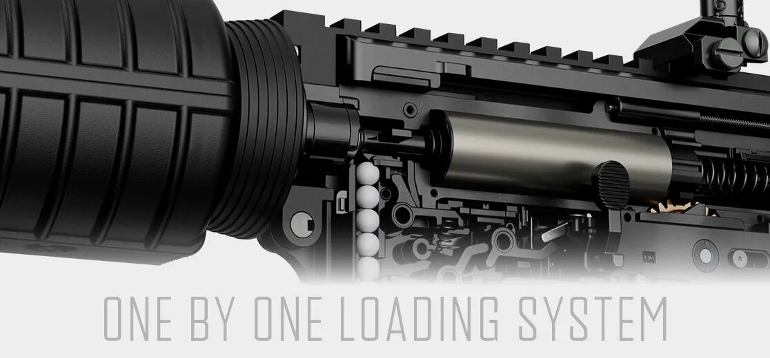 また、チャンバーへ1発BB弾を送るたびにシャッターが閉まることで発射後まで次弾が送り込まれない、「ワンバイワン ローディングシステム」も搭載しています。